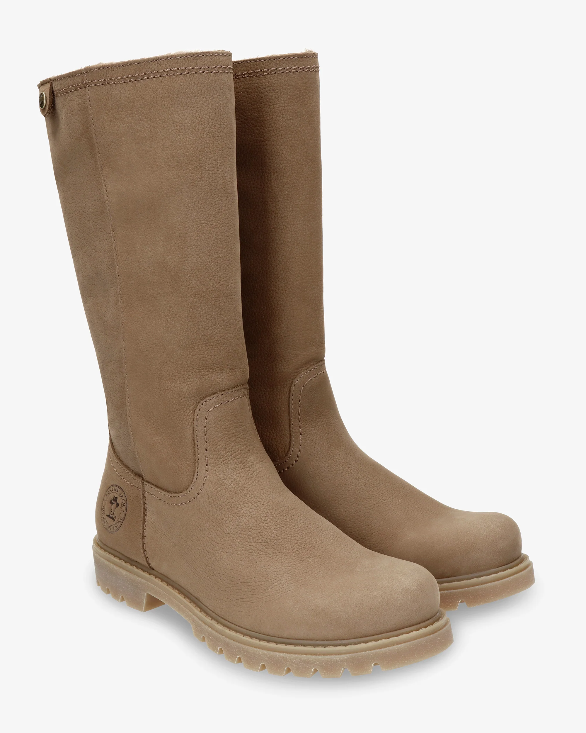 Flat women’s Boot. WATERPOOF Taupe Nobuck Leather. Warm lining. Removable anatomical insole. Natural, flexible and durable rubber sole. Shaft height: 28 cm. Heel height: 4 cm. 100% Made in Spain.