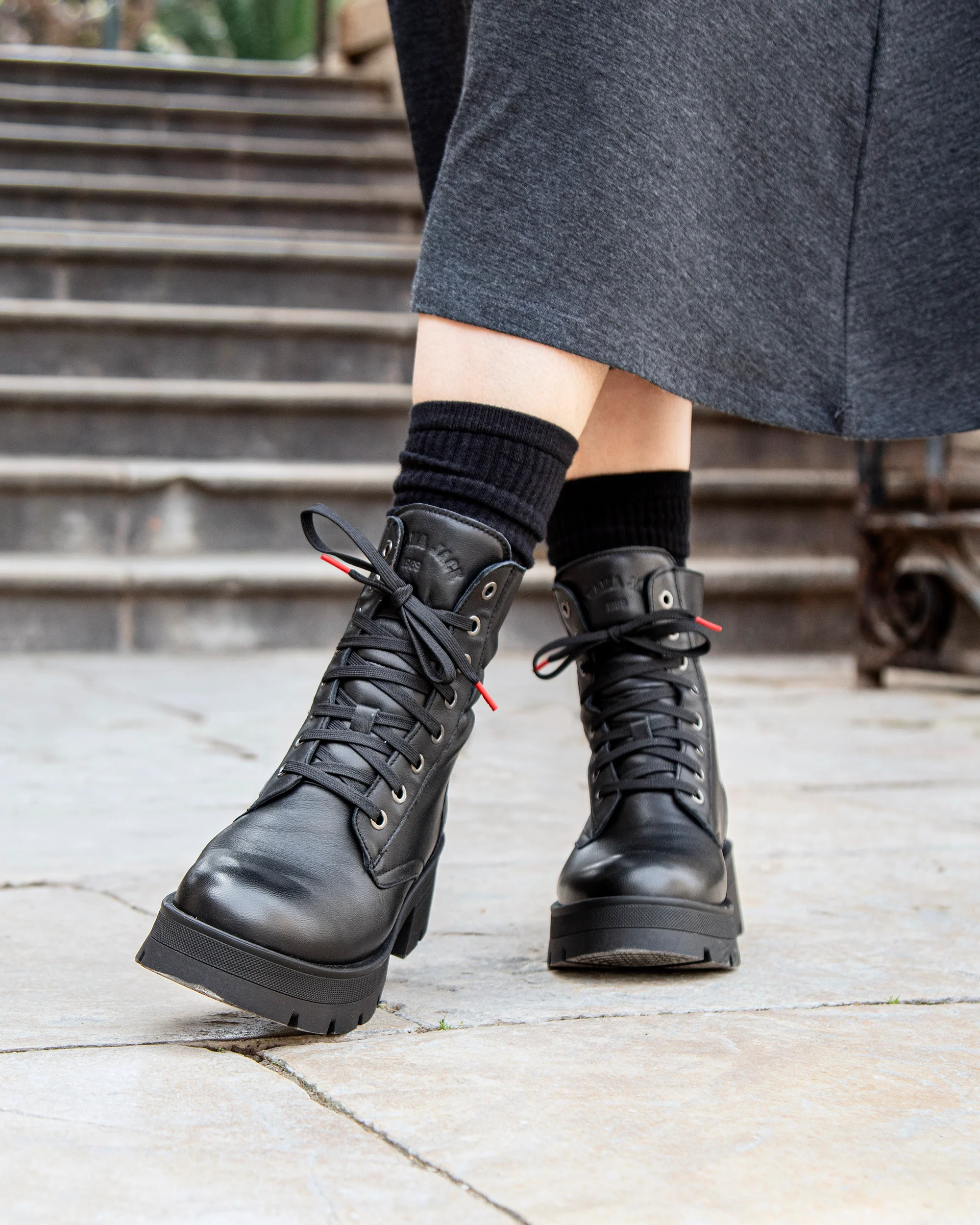 Women’s Boots with heel. Black Napa Leather. Lace-up Closure. Leather lining. Removable anatomical insole. Flexible and durable TR rubber sole. Shaft height: 15 cm. Heel height: 6.5 cm. 100% Made in Spain.