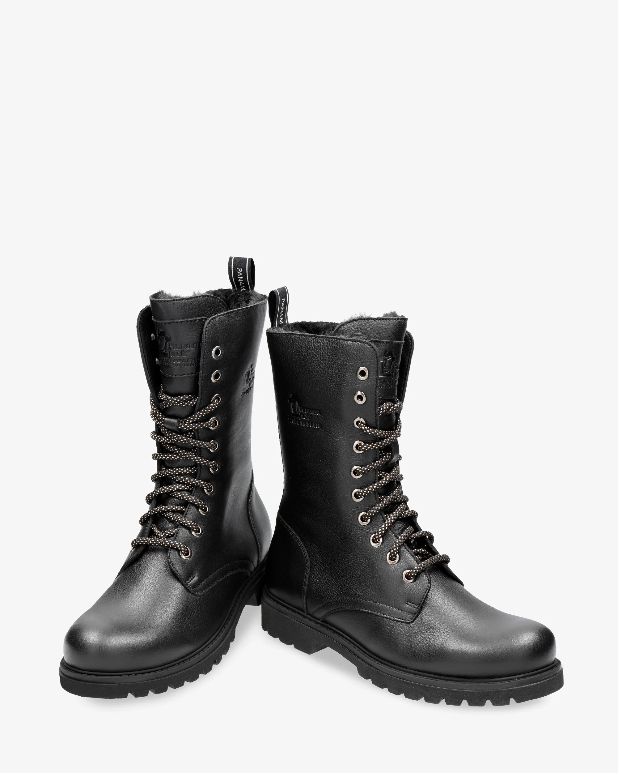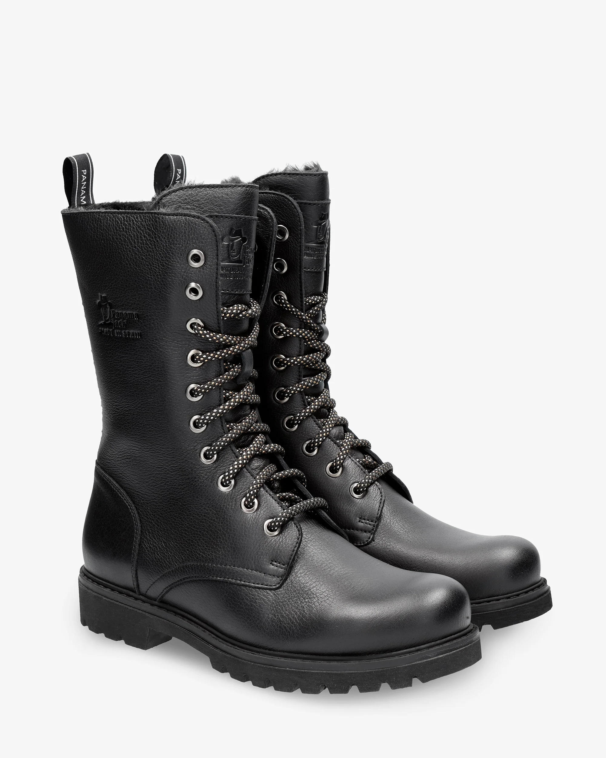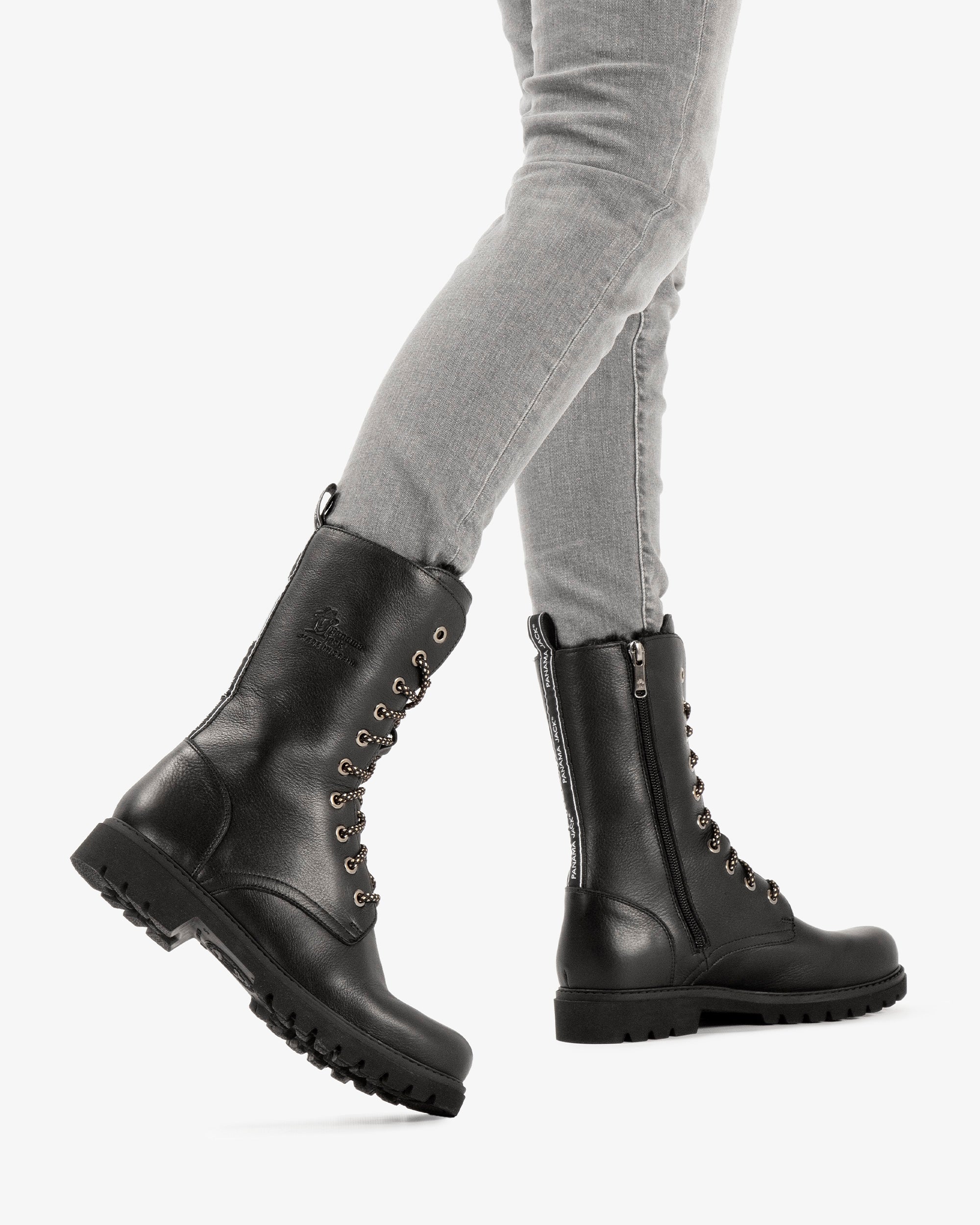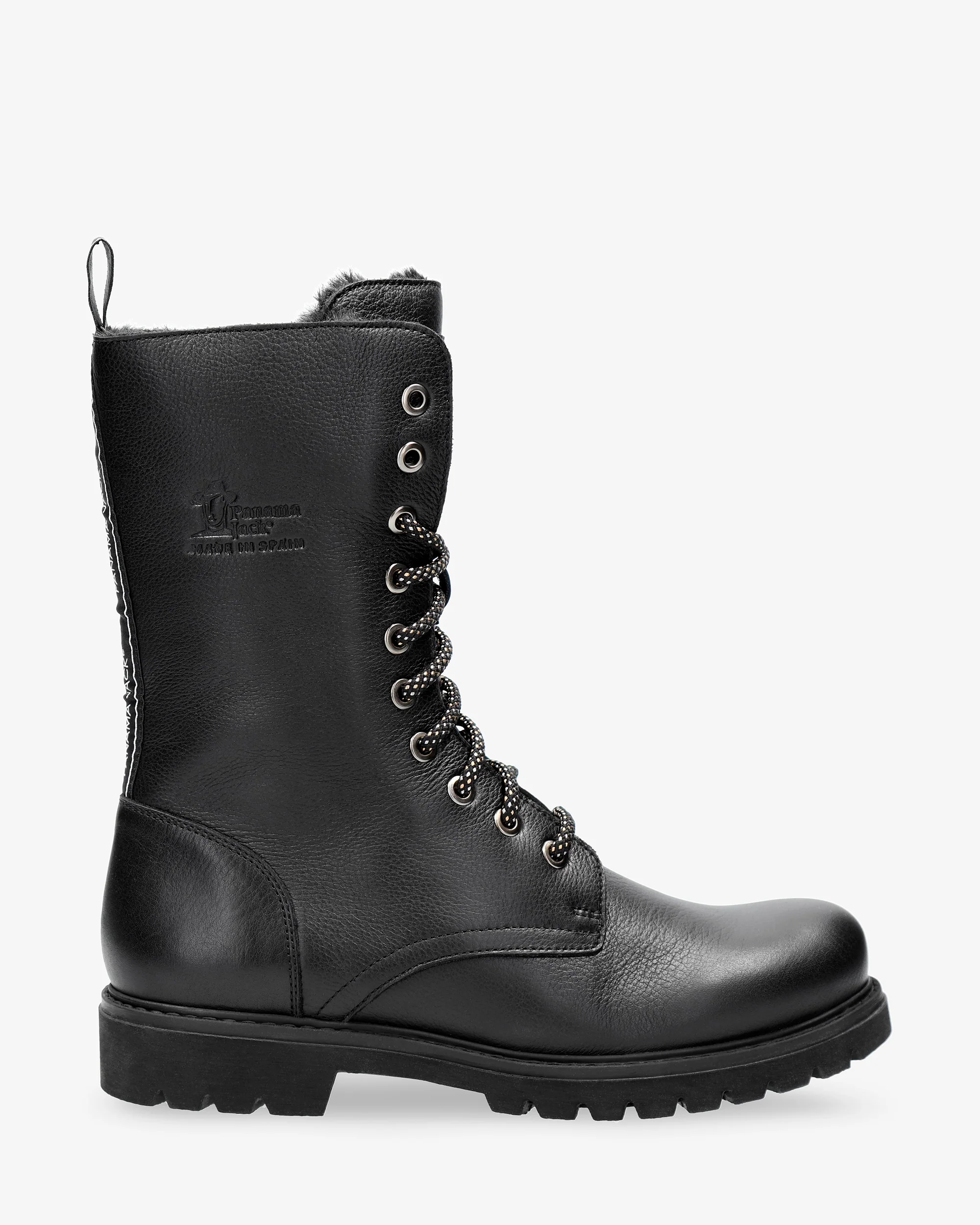 Flat women’s boots. WATERPROOF Black Napa Leather. Lace and zipper closure. Warm lining. Removable anatomical insole. Natural, flexible and durable rubber sole. Shaft height: 21 cm. Heel height: 4 cm. 100% Made in Spain.