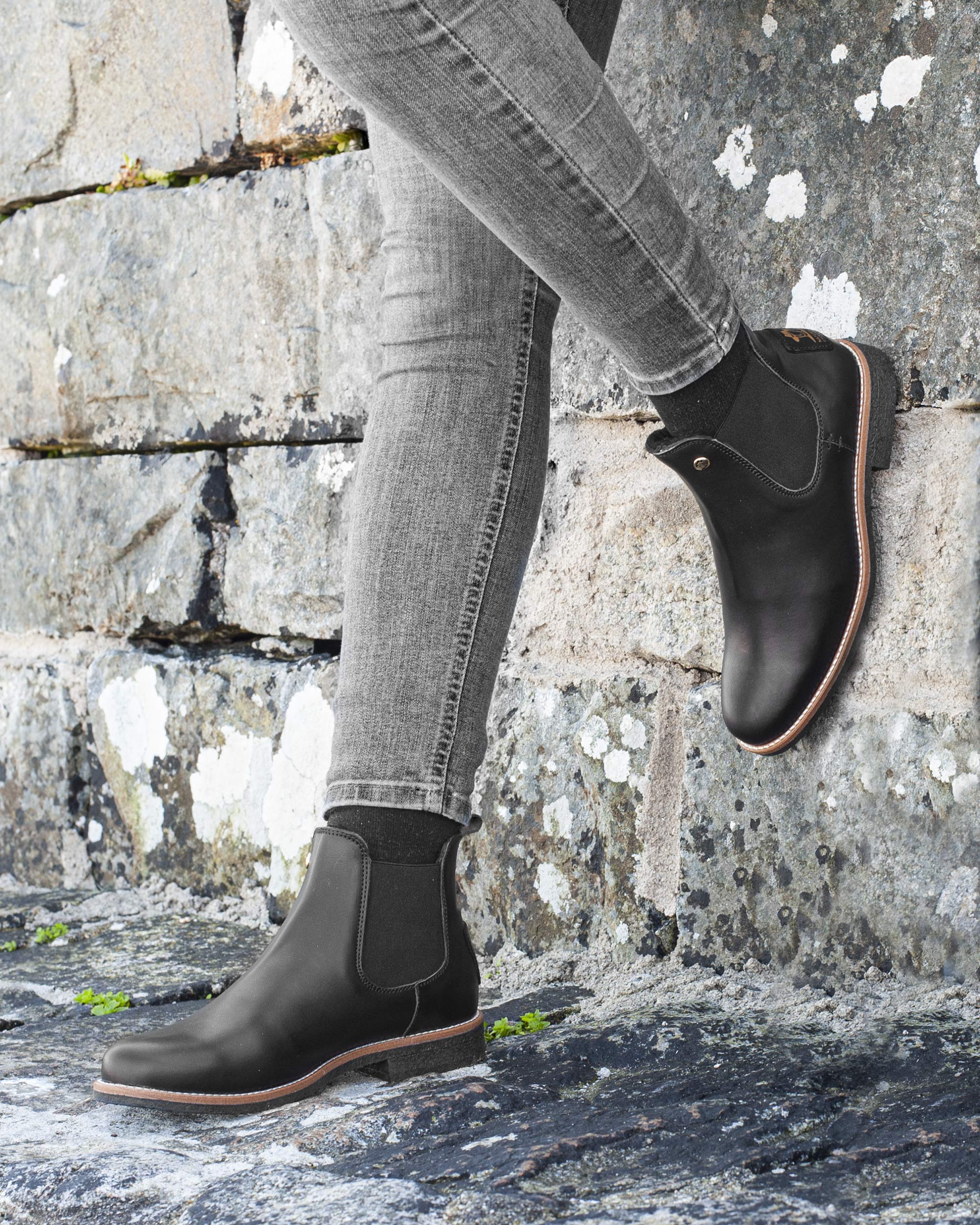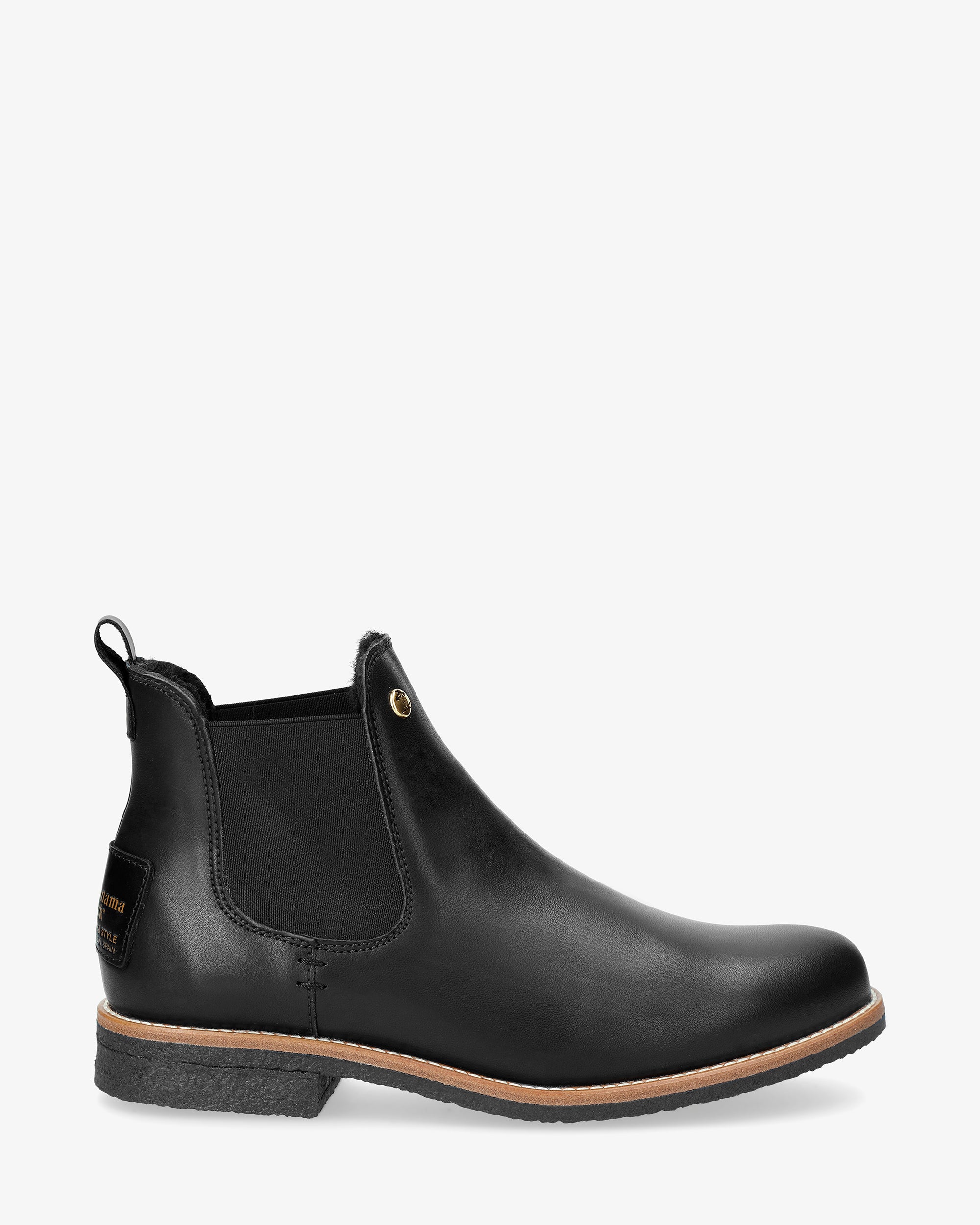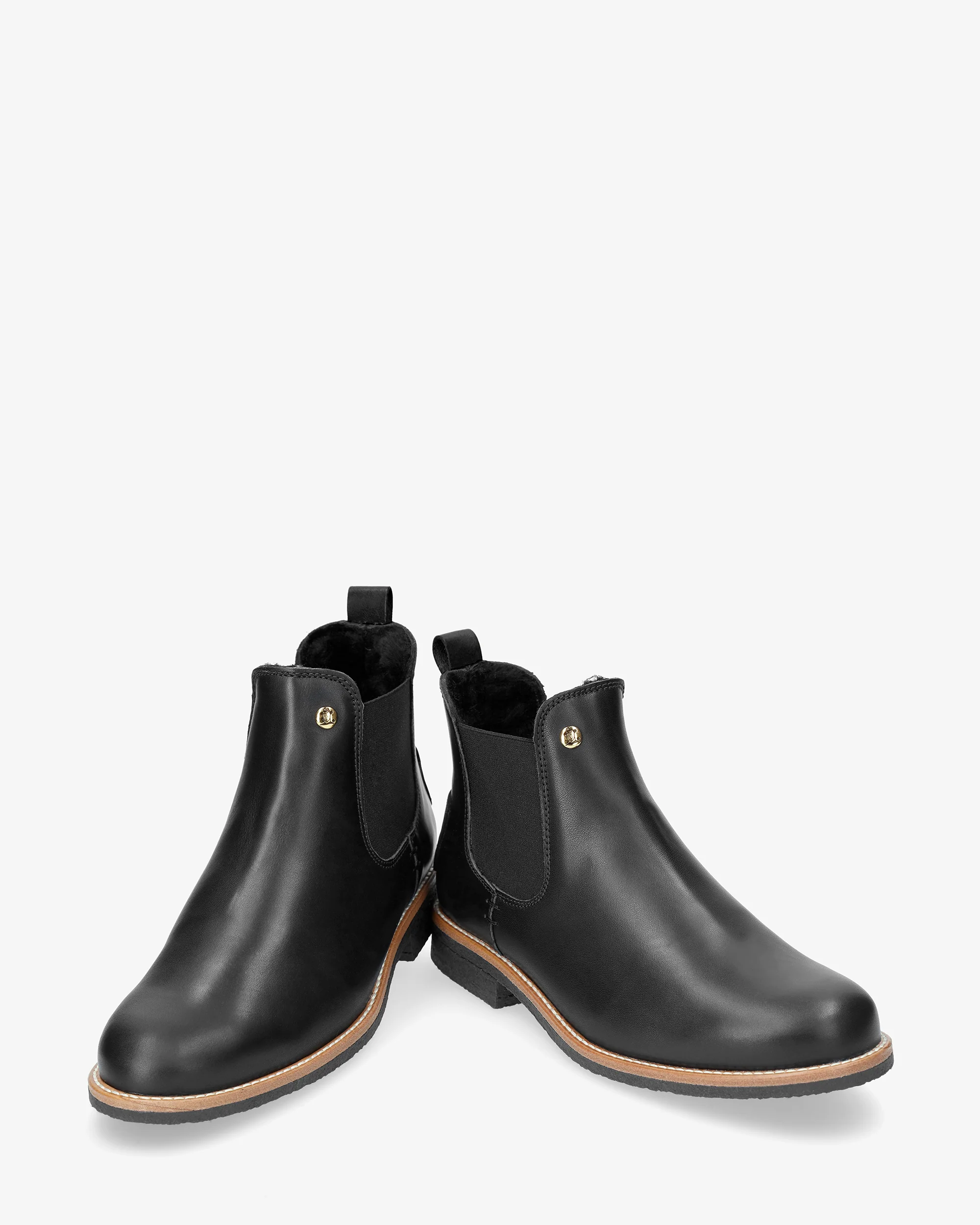 Flat women’s ankle boots. Black Napa Leather. Sheepskin lining. Anatomical insole. Flexible and durable TR rubber sole. Shaft height: 11 cm. Heel height: 3 cm. 100% Made in Spain.