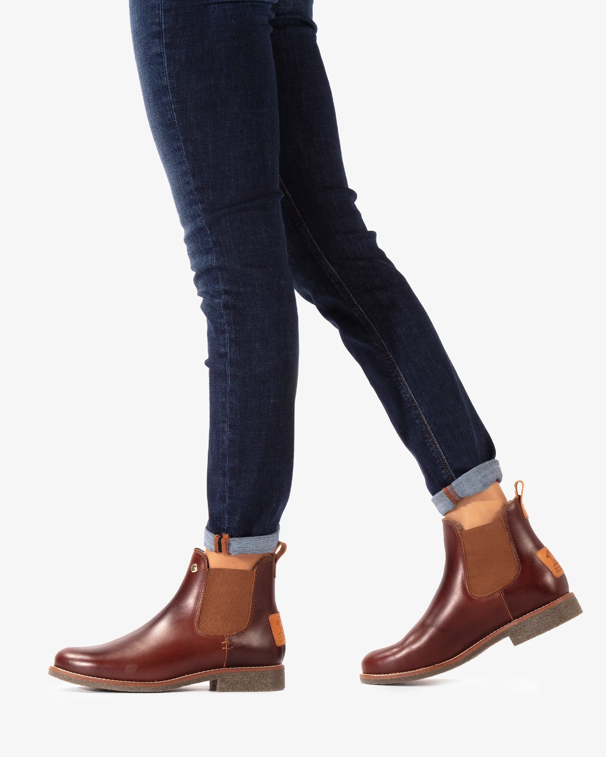 Flat women’s ankle boots. Tan Napa Leather. Sheepskin lining. Anatomical insole. Flexible and durable TR rubber sole. Shaft height: 11 cm. Heel height: 3 cm. 100% Made in Spain.