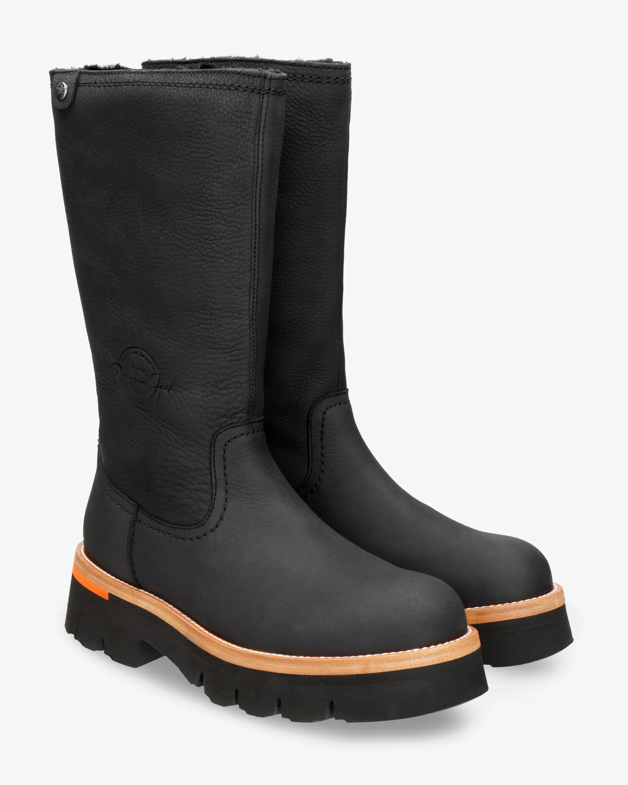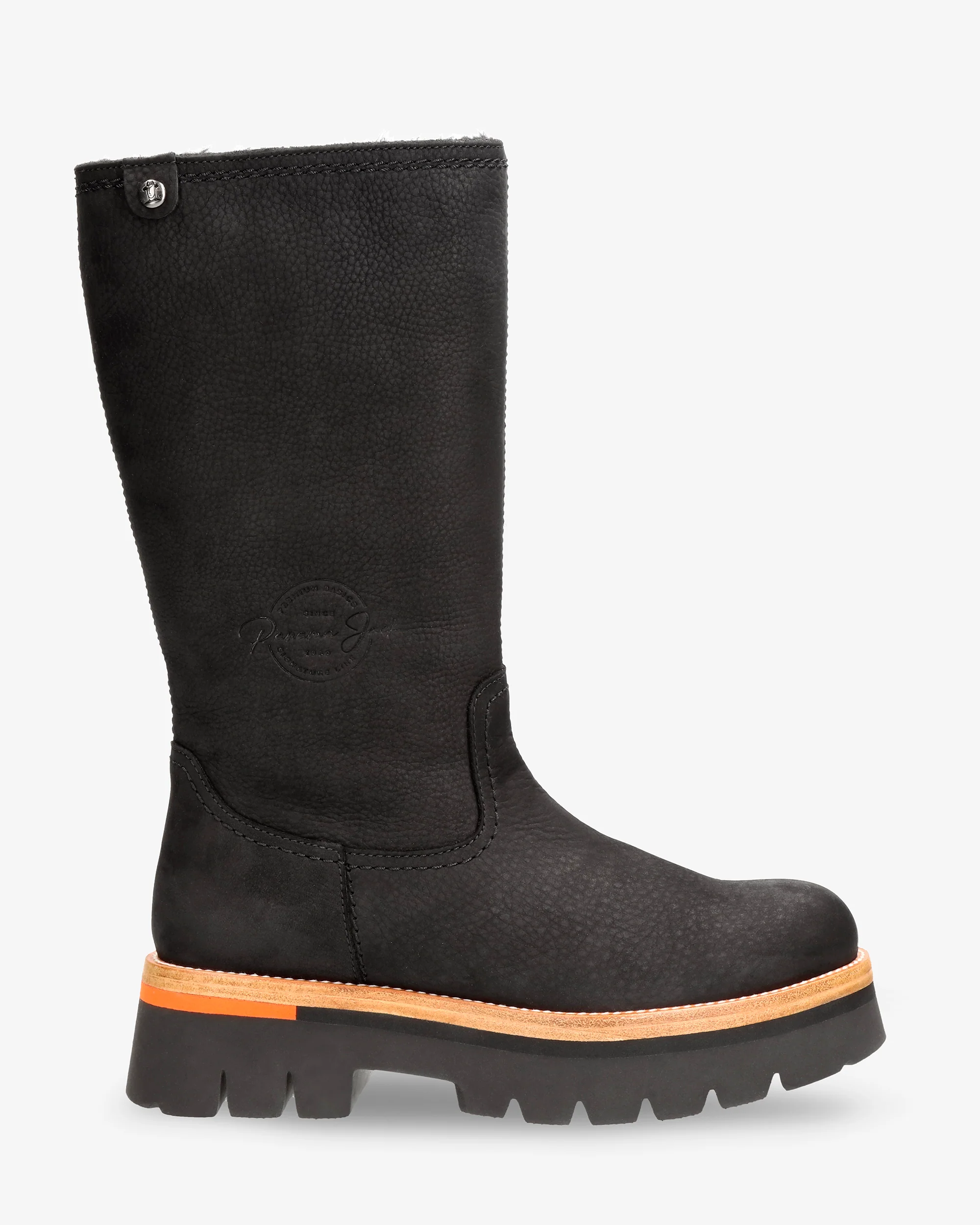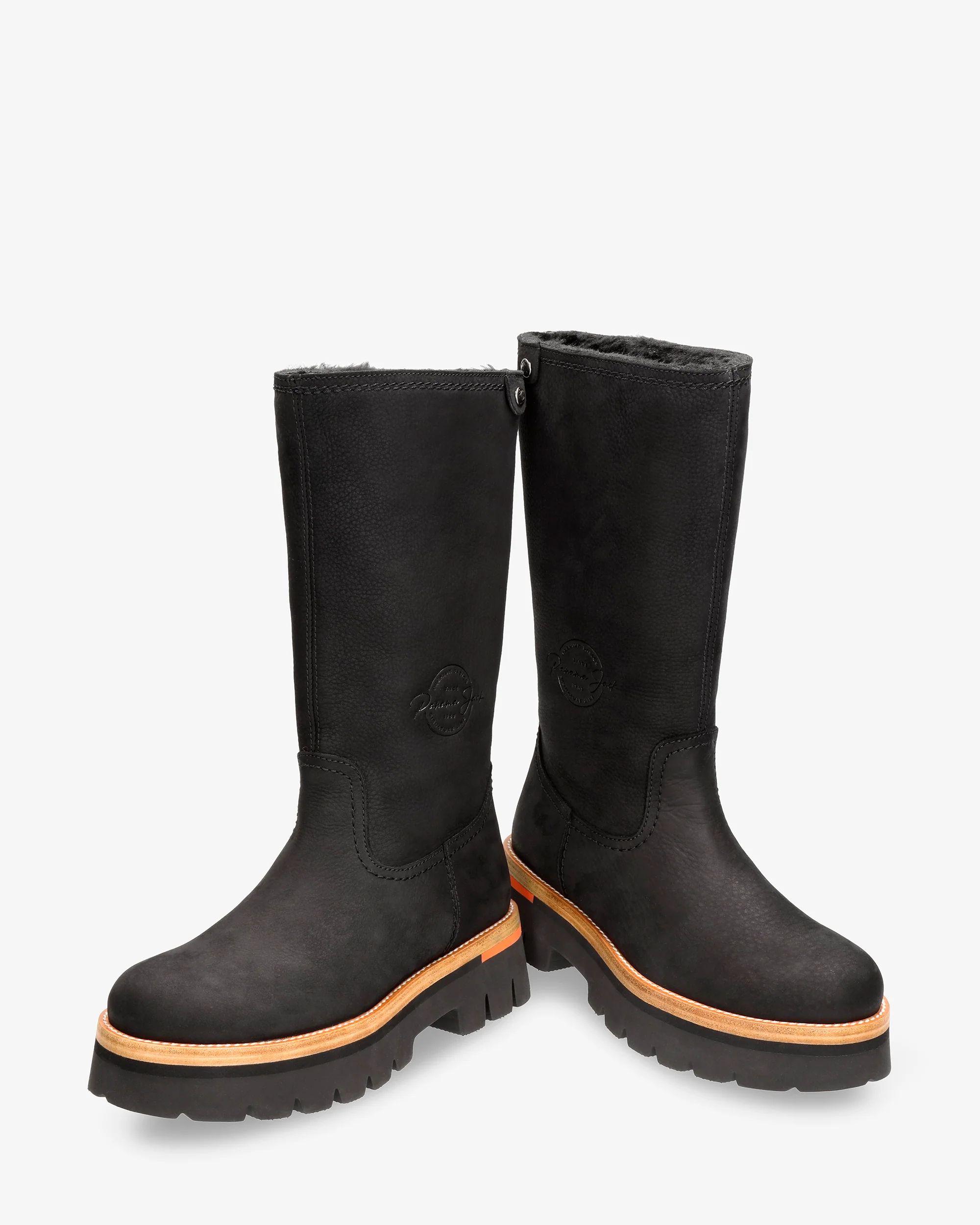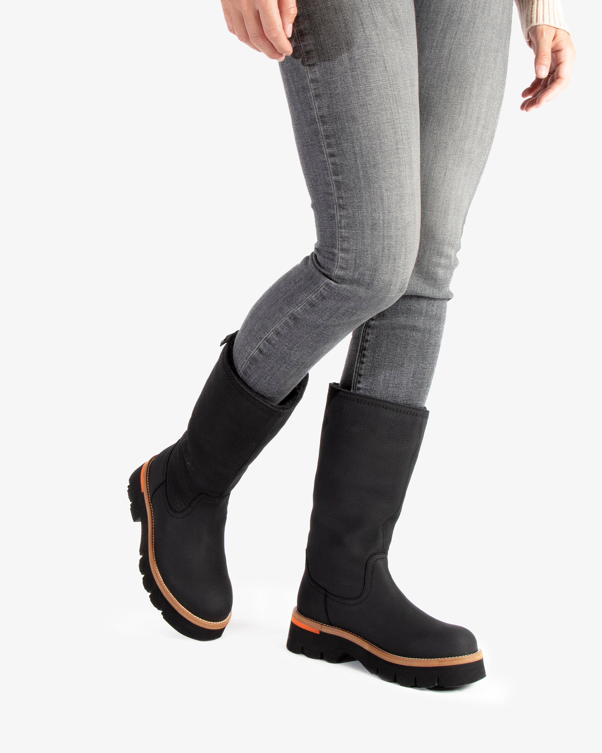 Women’s boots. WATERPROOF Black Nobuck Leather. Warm lining. Removable anatomical insole. Lightweight, flexible and strong EVA rubber sole. Shaft height: 29.6 cm. Heel height: 5.4 cm. 100% Made in Spain.