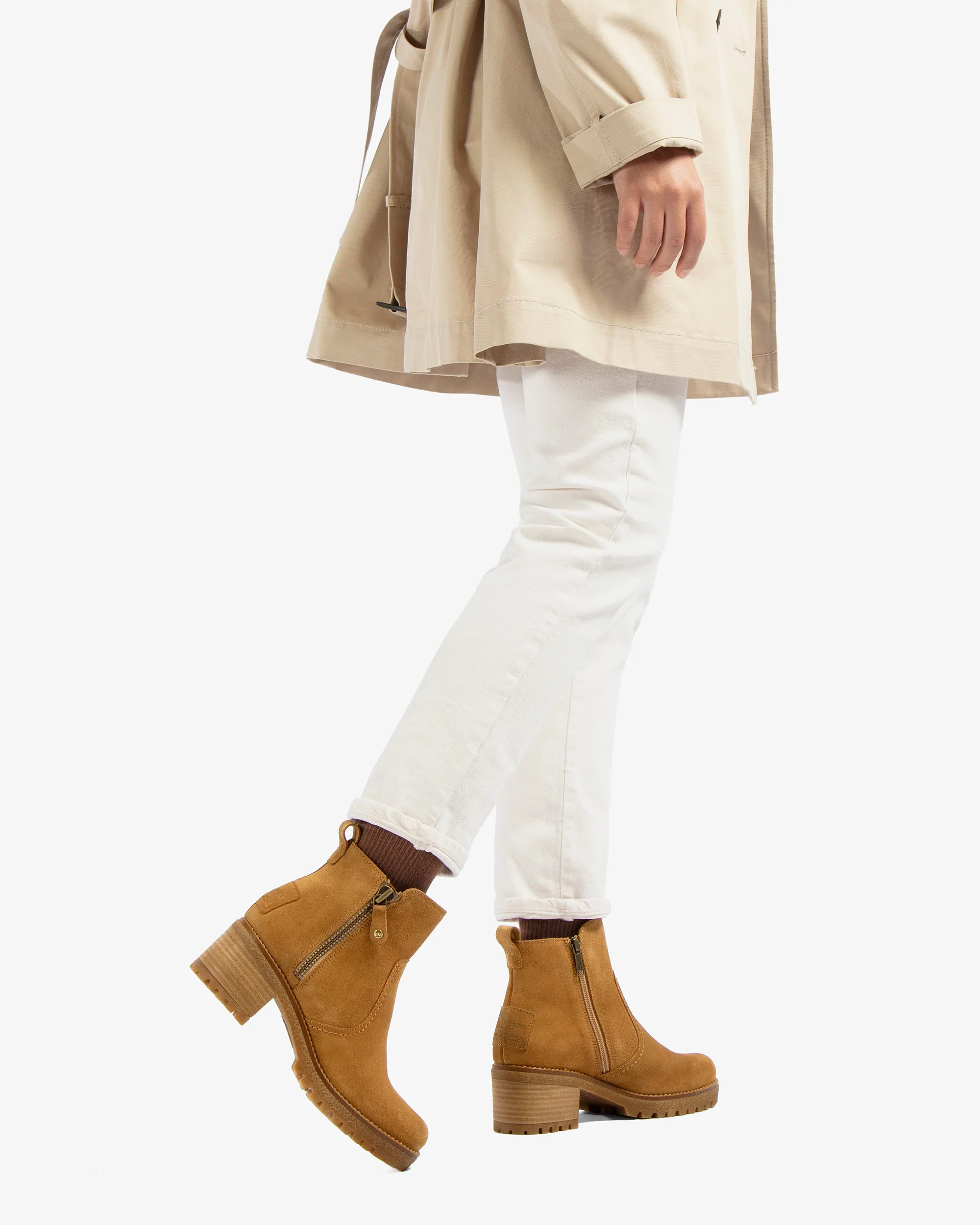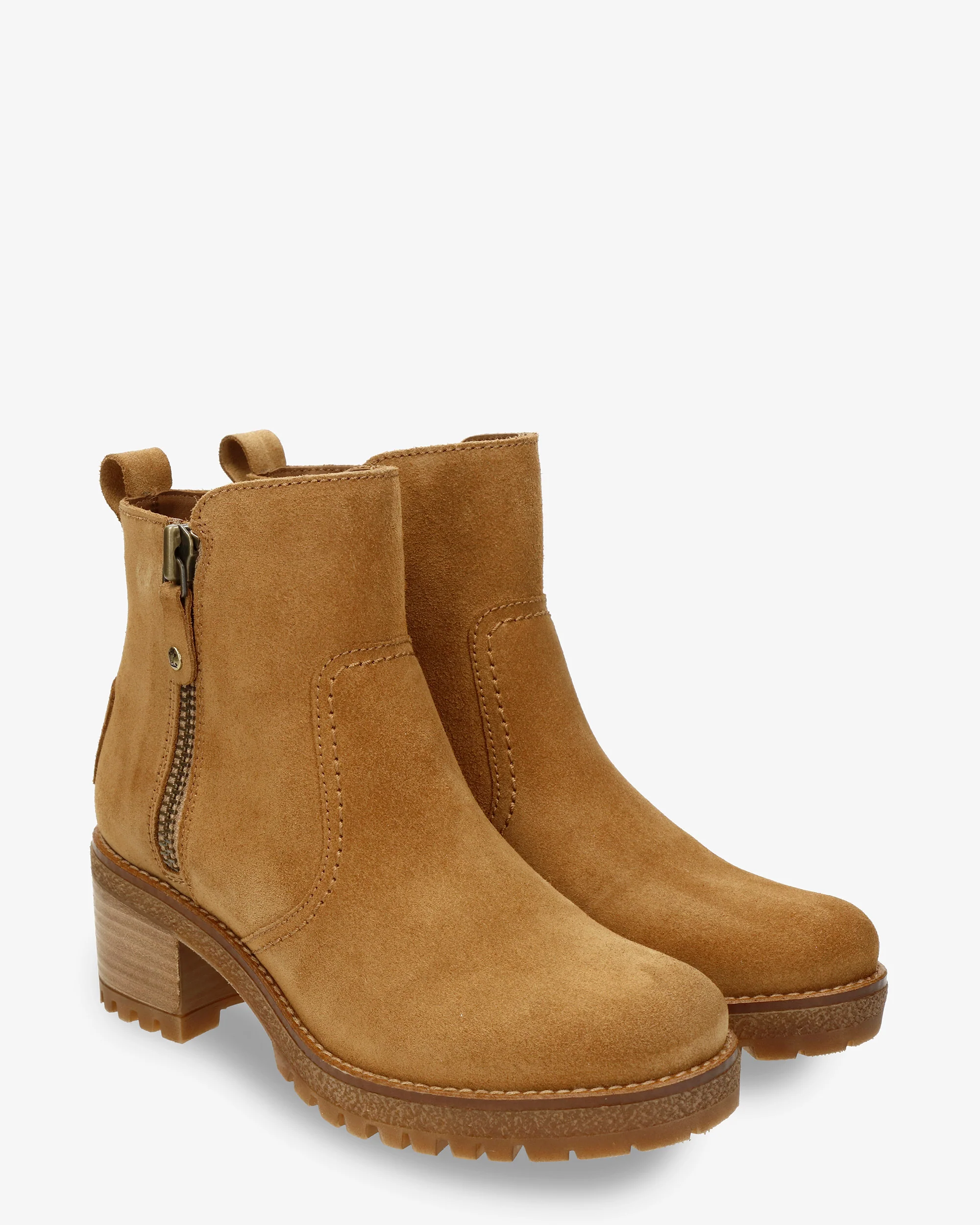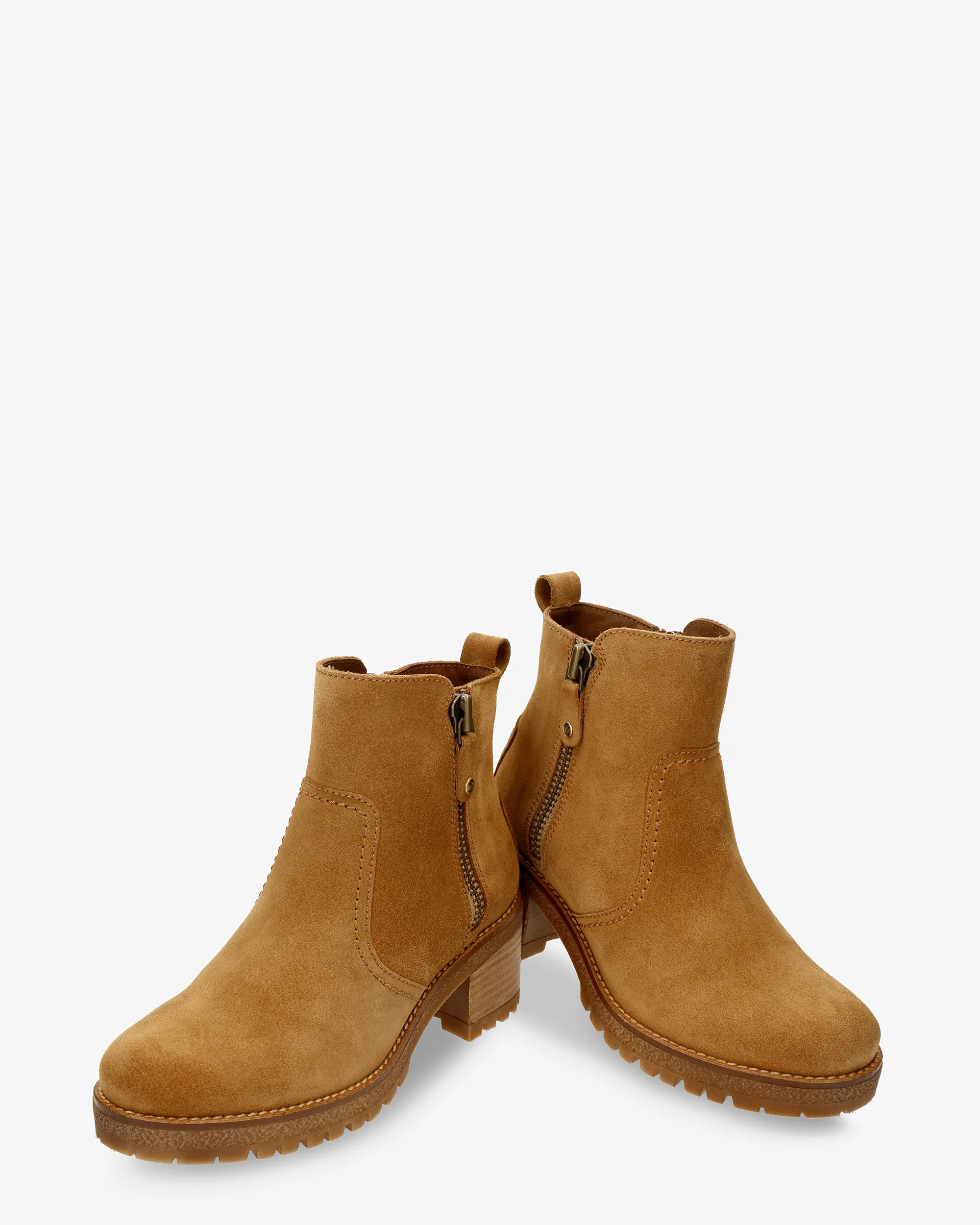 Women’s ankle boots with heels. WATERPROOF Tan Velour Leather. Zip Closure. Leather lining. Removable anatomical insole. Flexible and durable TR rubber sole. Shaft height: 11.5 cm. Heel height: 7.5 cm. 100% Made in Spain.